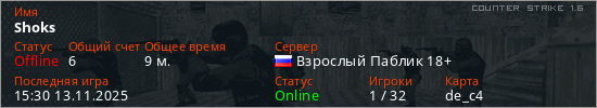 Играет на Counter Strike 1.6 сервере. Страна: РоссияПервый раз замечен 17:46 31.10.2025
