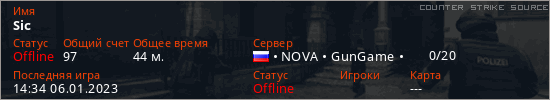 Играет на Counter Strike Source сервере. Страна: РоссияПервый раз замечен 21:47 05.01.2023