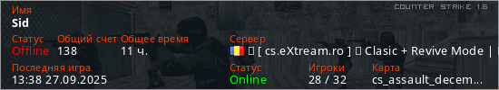 Последний раз был в сети 13:38 27.09.2025 Игрок с таким ником замечен на 21 сервере