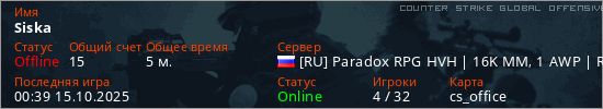 Играет на Counter Strike Global Offensive сервере. Страна: РоссияПервый раз замечен 00:35 15.10.2025