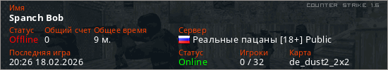 Играет на Counter Strike 1.6 сервере. Страна: РоссияПервый раз замечен 20:11 18.02.2026