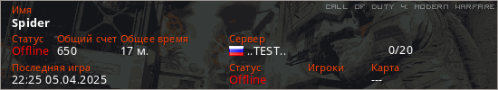 Играет на Call of Duty 4: Modern Warfare сервере. Страна: РоссияПервый раз замечен 18:11 22.02.2025