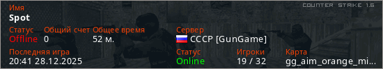 Играет на Counter Strike 1.6 сервере. Страна: РоссияПервый раз замечен 19:13 28.12.2025