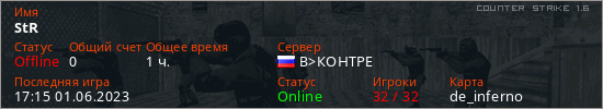 Играет на Counter Strike 1.6 сервере. Страна: РоссияПервый раз замечен 20:31 23.05.2023