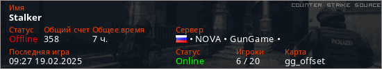 Играет на Counter Strike Source сервере. Страна: РоссияПервый раз замечен 16:56 13.12.2022