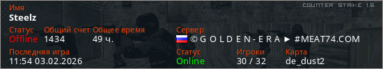 Играет на Counter Strike 1.6 сервере. Страна: РоссияПервый раз замечен 08:05 16.01.2023
