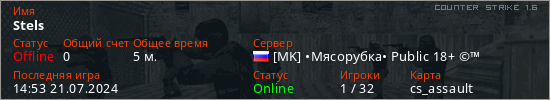 Играет на Counter Strike 1.6 сервере. Страна: РоссияПервый раз замечен 14:47 21.07.2024