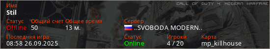 Играет на Call of Duty 4: Modern Warfare сервере. Страна: РоссияПервый раз замечен 21:29 16.09.2025