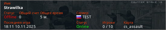 Играет на Counter Strike 1.6 сервере. Страна: РоссияПервый раз замечен 17:59 10.11.2025