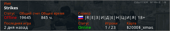 Играет на Counter Strike 1.6 сервере. Страна: РоссияПервый раз замечен 14:45 25.01.2019