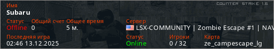 Играет на Counter Strike 1.6 сервере. Страна: СШАПервый раз замечен 02:44 13.12.2025