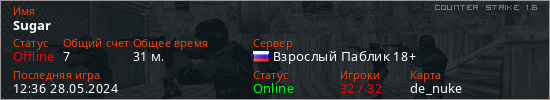 Играет на Counter Strike 1.6 сервере. Страна: РоссияПервый раз замечен 13:15 20.08.2023