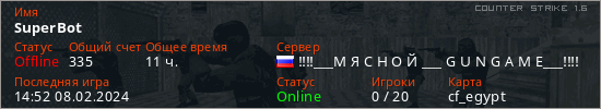 Играет на Counter Strike 1.6 сервере. Страна: РоссияПервый раз замечен 14:49 19.01.2023