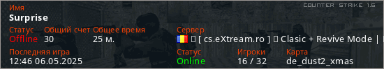 Играет на Counter Strike 1.6 сервере. Страна: РумынияПервый раз замечен 13:08 12.04.2025
