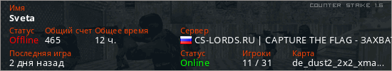 Играет на Counter Strike 1.6 сервере. Страна: РоссияПервый раз замечен 09:54 30.07.2021