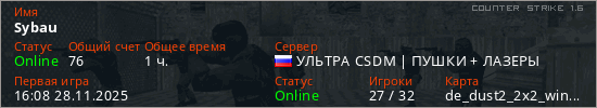 Играет на Counter Strike 1.6 сервере. Страна: РоссияПервый раз замечен 16:08 28.11.2025