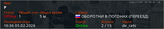 Играет на Counter Strike 1.6 сервере. Страна: РоссияПервый раз замечен 10:30 05.02.2026