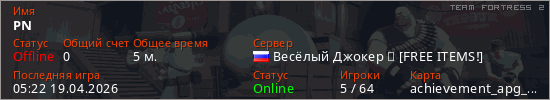 Играет на Team Fortress 2 сервере. Страна: РоссияПервый раз замечен 05:20 19.04.2026