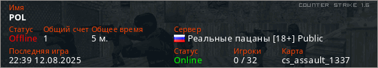 Играет на Counter Strike 1.6 сервере. Страна: РоссияПервый раз замечен 22:34 12.08.2025