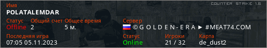 Играет на Counter Strike 1.6 сервере. Страна: РоссияПервый раз замечен 07:03 05.11.2023