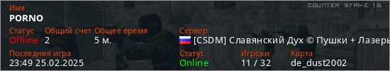 Играет на Counter Strike 1.6 сервере. Страна: РоссияПервый раз замечен 23:47 25.02.2025