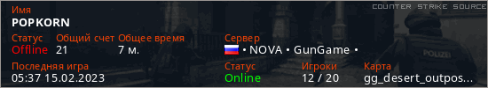 Играет на Counter Strike Source сервере. Страна: РоссияПервый раз замечен 05:33 15.02.2023