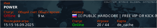 Играет на Counter Strike Global Offensive сервере. Страна: РоссияПервый раз замечен 14:20 16.09.2025