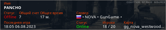 Играет на Counter Strike Source сервере. Страна: РоссияПервый раз замечен 14:47 06.08.2023