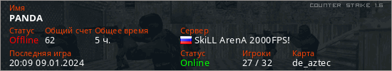 Играет на Counter Strike 1.6 сервере. Страна: РоссияПервый раз замечен 18:48 19.08.2022