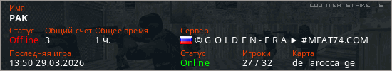 Играет на Counter Strike 1.6 сервере. Страна: РоссияПервый раз замечен 20:21 03.03.2026