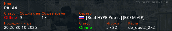 Играет на Counter Strike 1.6 сервере. Страна: РоссияПервый раз замечен 11:43 22.04.2024