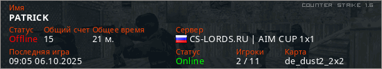 Играет на Counter Strike 1.6 сервере. Страна: РоссияПервый раз замечен 08:32 14.09.2024