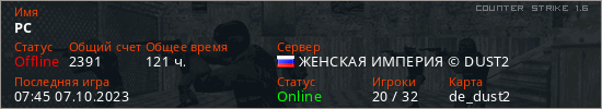 Играет на Counter Strike 1.6 сервере. Страна: РоссияПервый раз замечен 23:02 13.08.2021