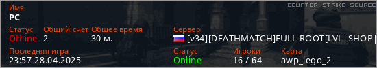 Играет на Counter Strike Source сервере. Страна: РоссияПервый раз замечен 15:45 23.06.2023
