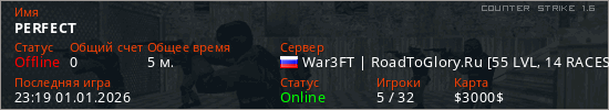 Играет на Counter Strike 1.6 сервере. Страна: РоссияПервый раз замечен 23:17 01.01.2026