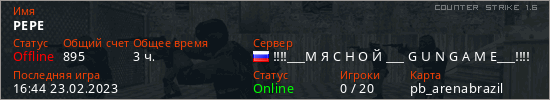 Играет на Counter Strike 1.6 сервере. Страна: РоссияПервый раз замечен 13:12 30.08.2022