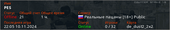 Играет на Counter Strike 1.6 сервере. Страна: РоссияПервый раз замечен 22:15 03.03.2023