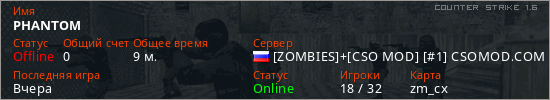 Играет на Counter Strike 1.6 сервере. Страна: РоссияПервый раз замечен 04:55 28.03.2026