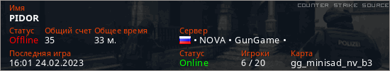 Играет на Counter Strike Source сервере. Страна: РоссияПервый раз замечен 11:53 27.12.2022