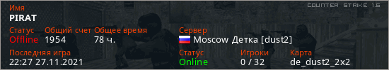Играет на Counter Strike 1.6 сервере. Страна: РоссияПервый раз замечен 14:53 02.08.2020