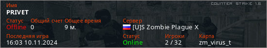Играет на Counter Strike 1.6 сервере. Страна: РоссияПервый раз замечен 18:05 17.06.2023