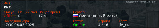 Играет на Counter Strike 1.6 сервере. Страна: РоссияПервый раз замечен 12:56 08.03.2023