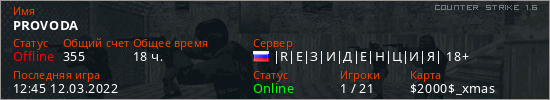 Играет на Counter Strike 1.6 сервере. Страна: РоссияПервый раз замечен 11:27 08.03.2022
