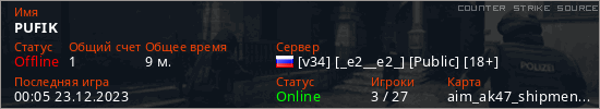 Играет на Counter Strike Source сервере. Страна: РоссияПервый раз замечен 20:43 27.11.2023