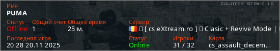 Играет на Counter Strike 1.6 сервере. Страна: РумынияПервый раз замечен 06:45 01.05.2025