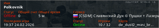 Играет на Counter Strike 1.6 сервере. Страна: РоссияПервый раз замечен 19:35 24.02.2026