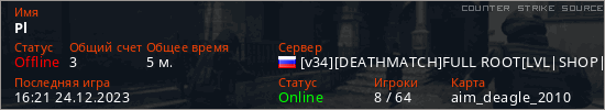 Играет на Counter Strike Source сервере. Страна: РоссияПервый раз замечен 16:19 24.12.2023