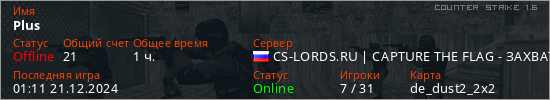 Последний раз был в сети 01:11 21.12.2024 Игрок с таким ником замечен на 15 серверах