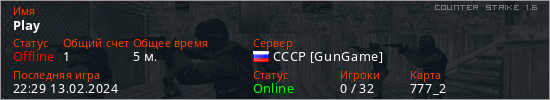 Играет на Counter Strike 1.6 сервере. Страна: РоссияПервый раз замечен 22:26 13.02.2024