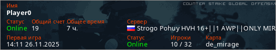 Играет на Counter Strike Global Offensive сервере. Страна: РоссияПервый раз замечен 14:11 26.11.2025